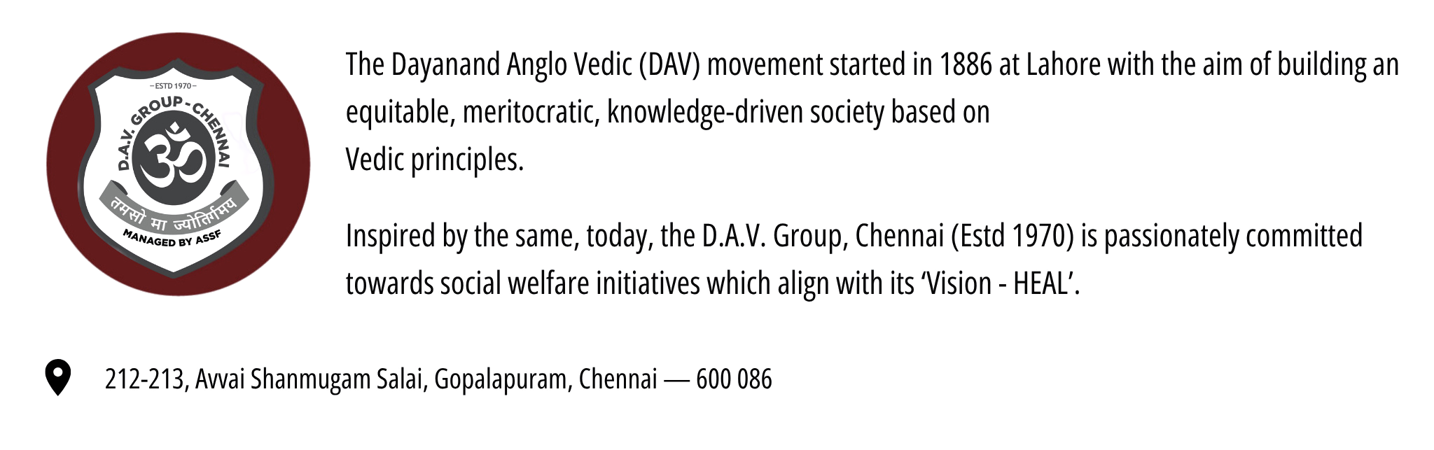 At D.A.V. Chennai, we offer holistic education built on the four Cs — Communication, Collaboration, Creativity, and Critical Thinking. Alongside academic excellence, we nurture patriotism, spirituality, compassion through service. Our aim is to shape well-rounded individuals who blend intellect with values and grow into leaders of strength, purpose, and peace.